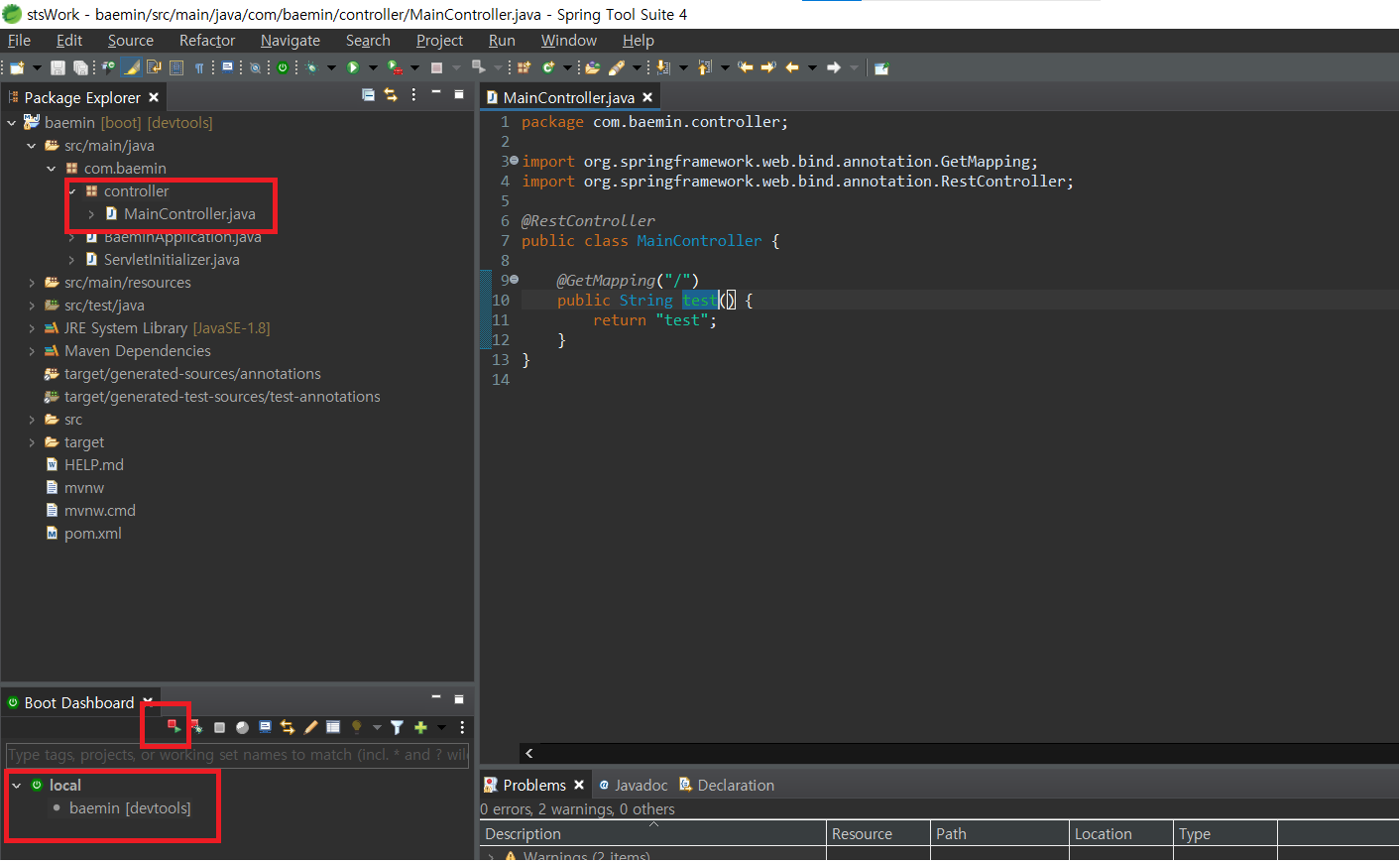 com.baemin 패키지 아래에 controller 패키지 생성후 MainController 클래스를 생성합니다