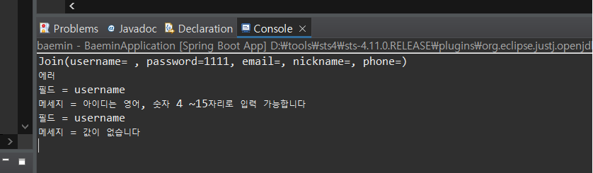 @Pattern 외에도 @NotBlank, @NotNull 등이 있지만 어노테이션을 여러개 붙일경우 형식에 맞지 않는 모든 메세지를 출력합니다