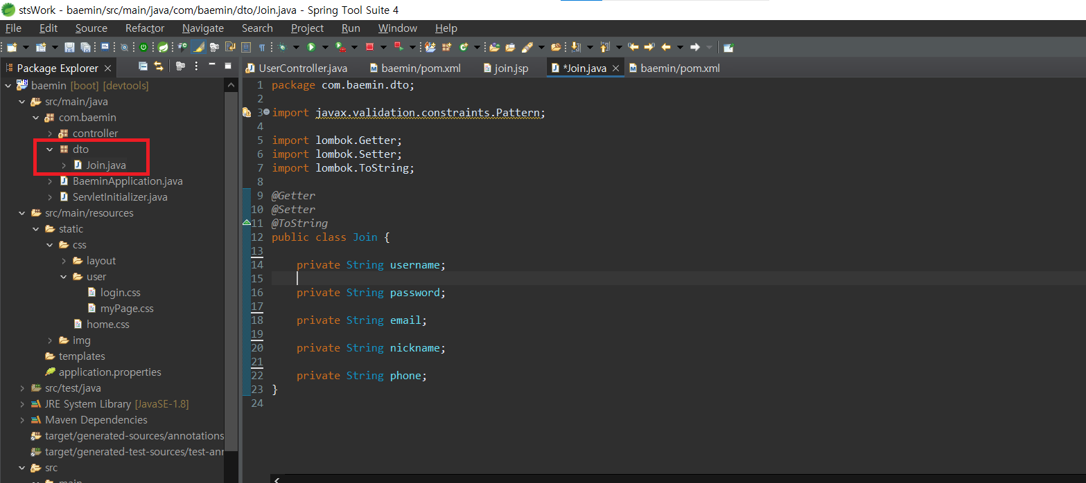 그래서 dto패키지를 추가하고 데이터를 받을 그릇인 join클래스를 생성합니다