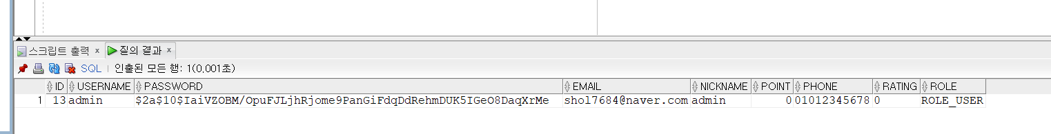 기존에 있던 아이디를 삭제하고 다시 회원가입을 하면 암호화된 비밀번호를 볼수있습니다