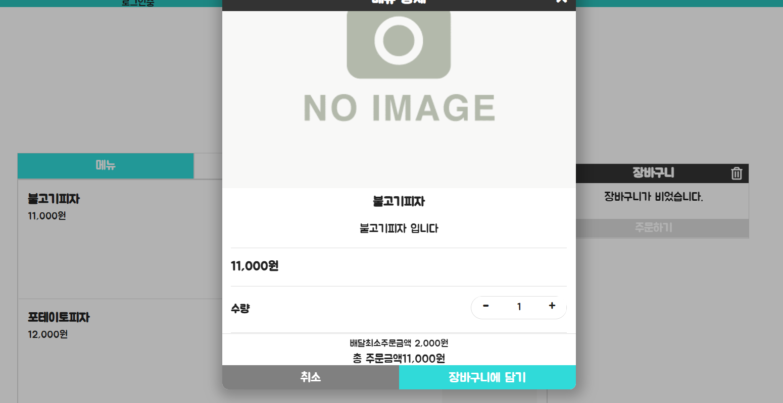 이후 메뉴목록을 클릭했을 때 모달이 나타납니다
