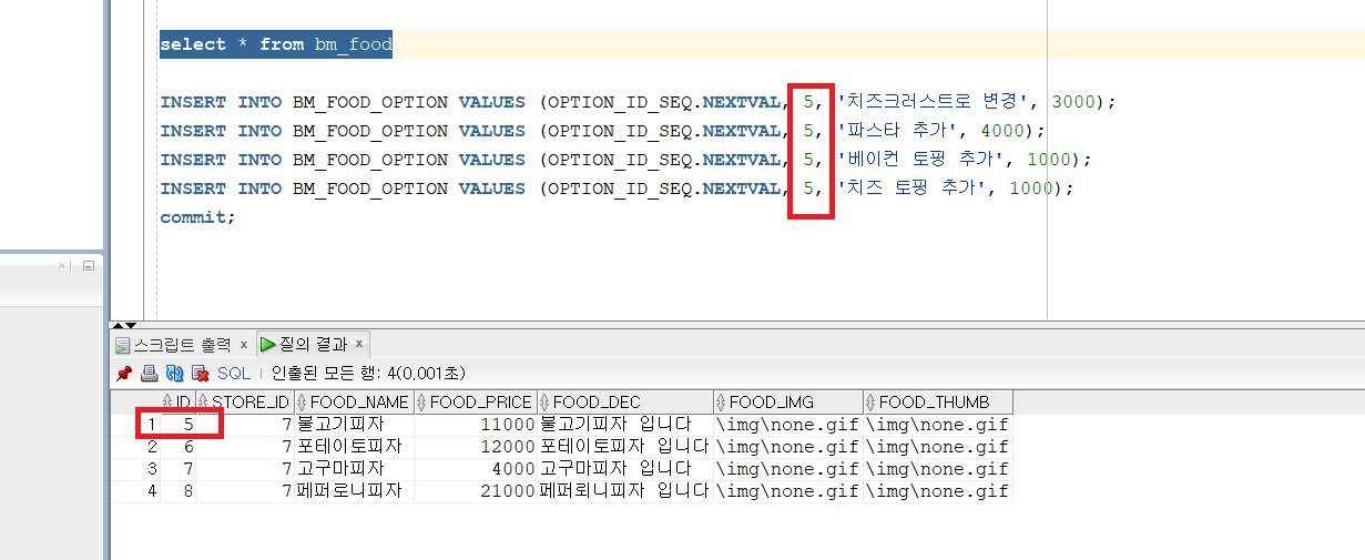 INSERT INTO BM_FOOD_OPTION VALUES (OPTION_ID_SEQ.NEXTVAL, 5, '치즈 토핑 추가', 1000);