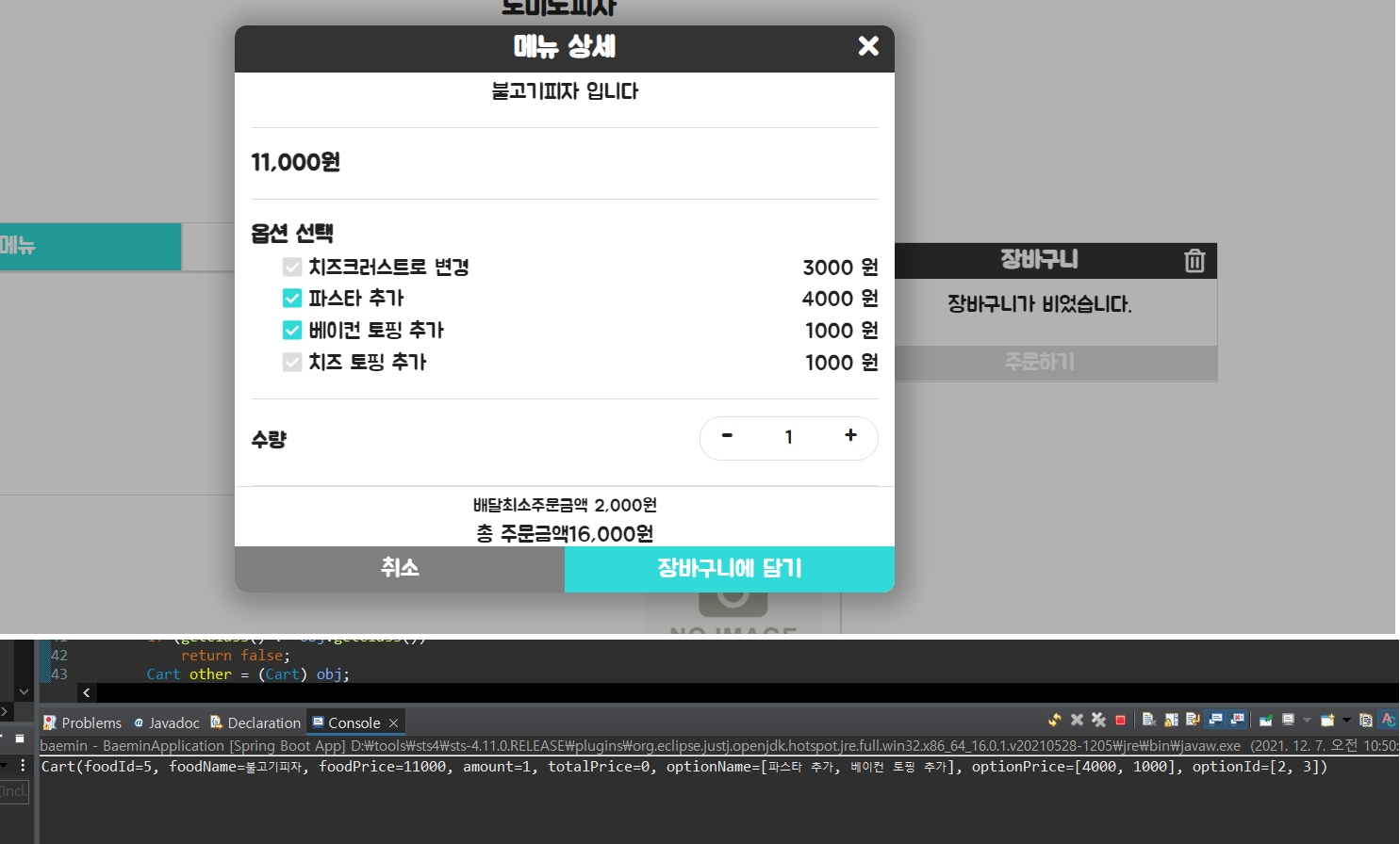 스프링부트+jsp로 배달사이트 만들기-11 장바구니추가, 삭제