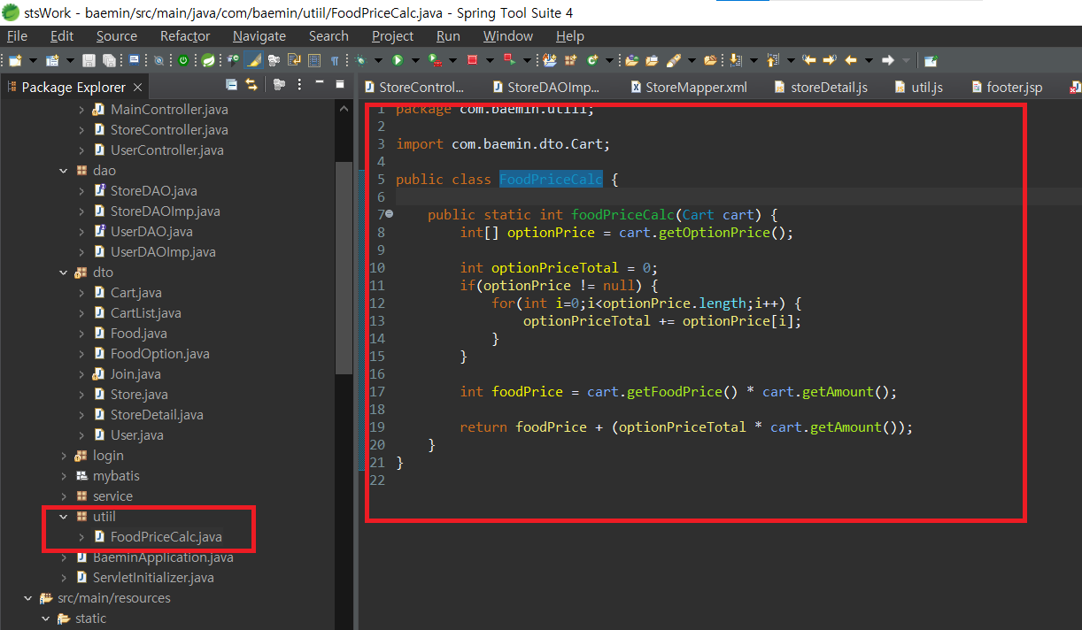 먼저 util패키지를 만들고 넘어온 음식 총합을 구할 FoodPriceCalc를 만듭니다
