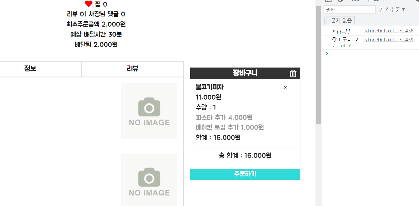 장바구니 정보 이외에 주문 시에 필요한 가게id,이름, 장바구니 가격 총 합, 배달팁을 미리 추가했습니다