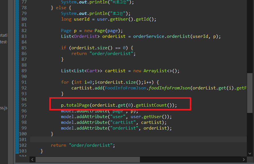 orderList메서드를 page와 함께 넘길 수 있게 변경하고 model에도 페이지정보를 담습니다