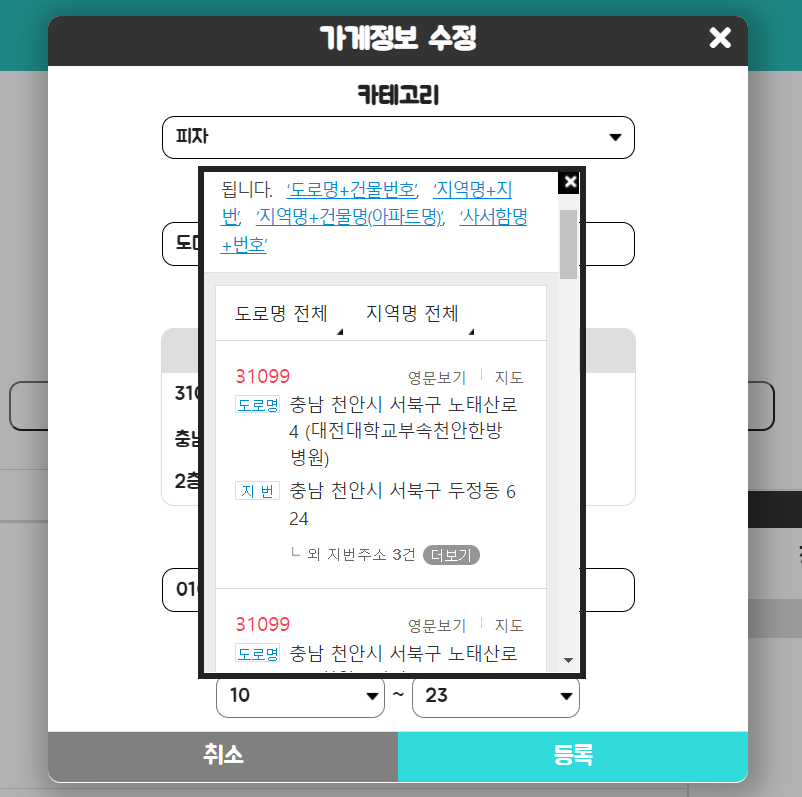 가게 주소 변경시에도 api를 사용해서 주소를 변경할 수 있게 해야합니다