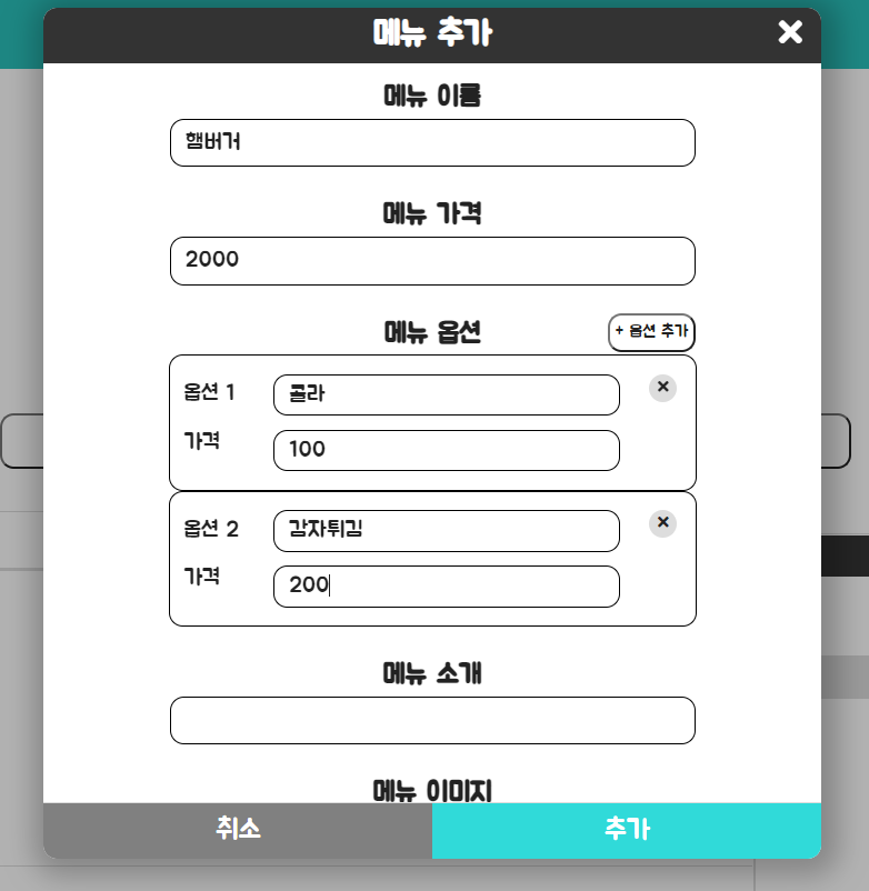 메뉴 정보를 담은 Food클래스와 옵션 추가하기 버튼을 눌러 생성한 박스 수 만큼 메뉴 옵션정보를 배열로 받습니다
